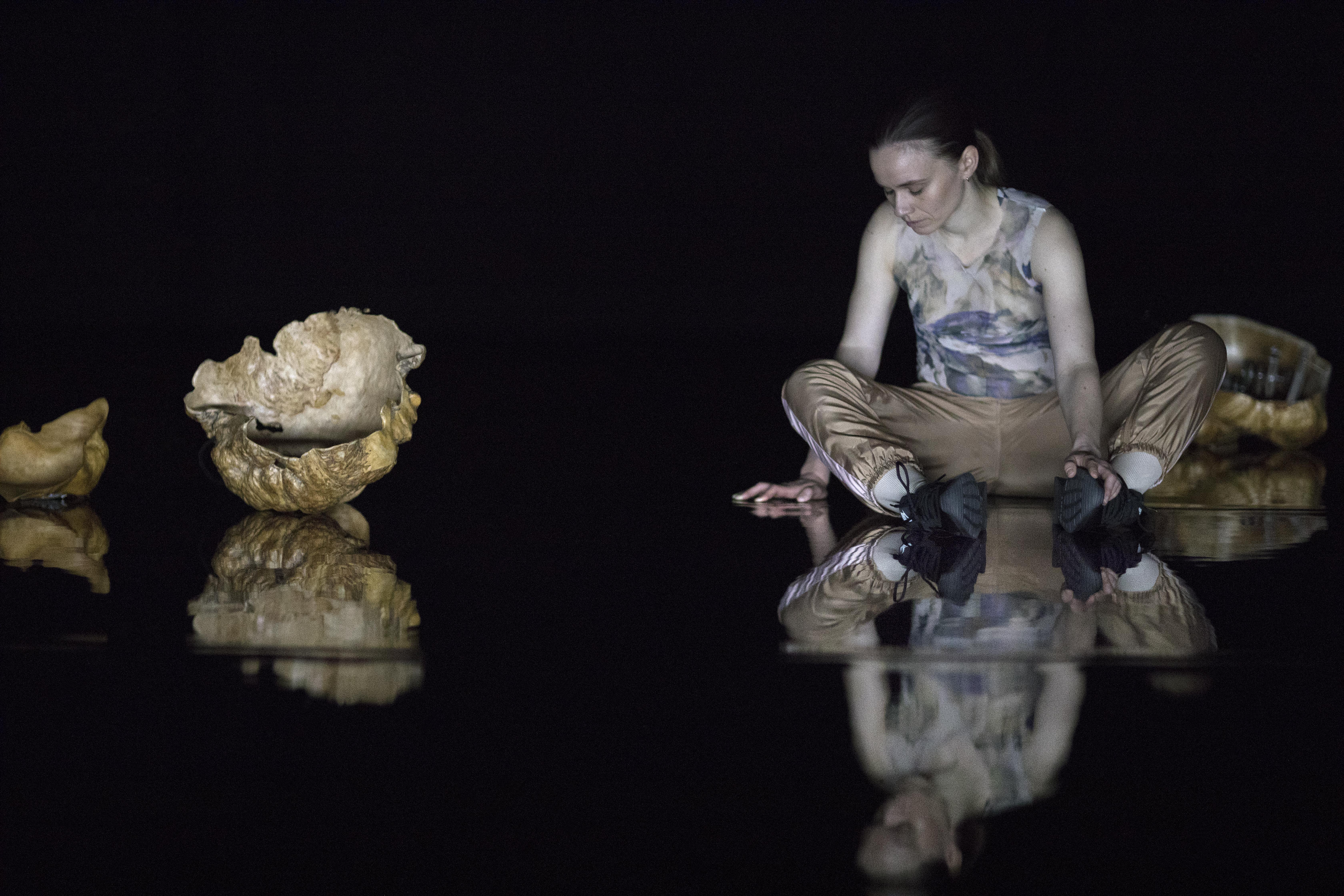 Oceanic is a solo performance made by Danish choreographer Marie Topp and Julia Giertz in collaboration with lighting designer Mårten K Axelsson and dramaturge Igor Dobričić. Oceanic is a reflection on listening and a feminist study of the hierarchies of sounds. Burl bowls are spread across the stage, following nature's own form with their unique and organic shapes. A woman is floating in a hallucinogenic sea, moving through what becomes a mythological landscape. She is evoking the past and present, voices and memories. Oceanic has an original, immersive sound set-up, including custom-made mechanical string instruments. Together, the protagonist, the sounding sculptures and the light create an embodied space for careful tuning and wild listening.